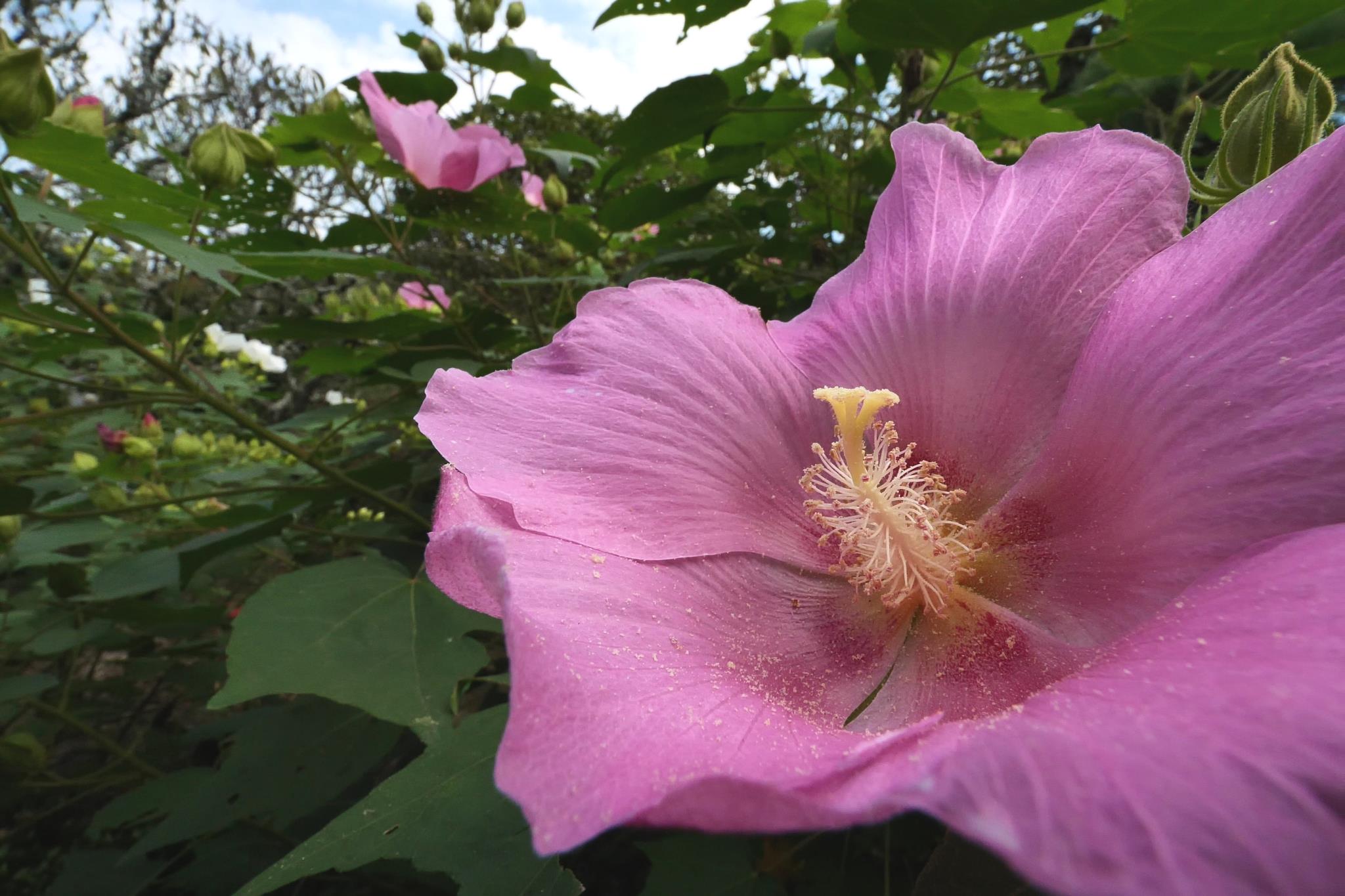 芙蓉のピンクの柔らかい色ですが、超広角で迫力あります。