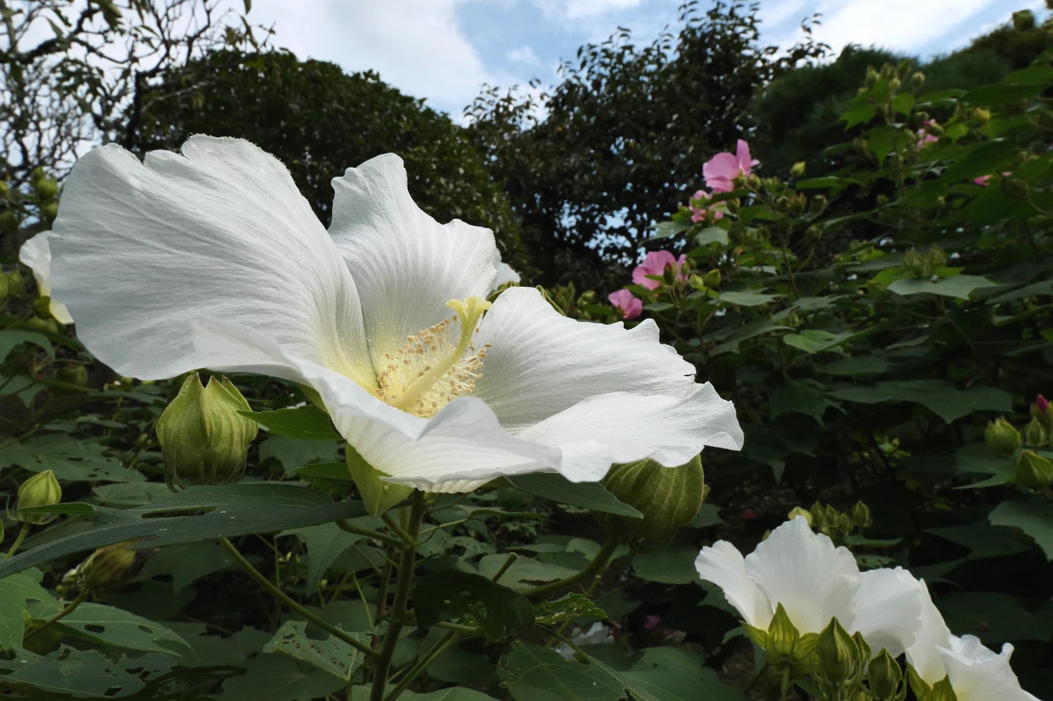 芙蓉の花は朝に咲いて夕方にはしぼむ一日花で、その分はかなさを感じます。