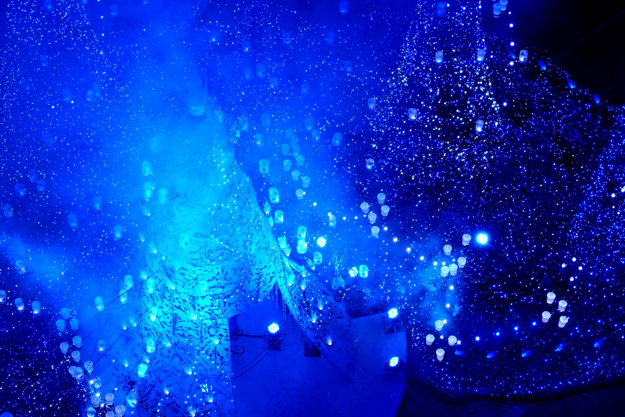広場の横の高架の通路からガラス越しに見下ろして撮りました。三脚を使用しています。