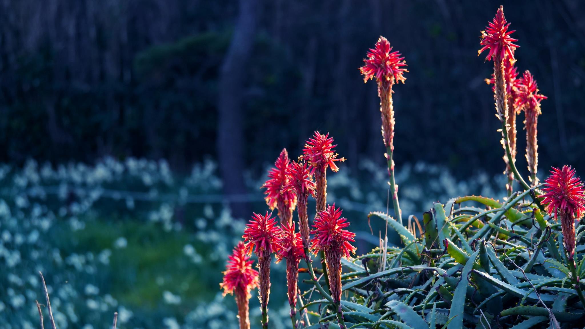 水仙の群生地に一叢のアロエの花が咲いていました。西日に輝いて見えました。