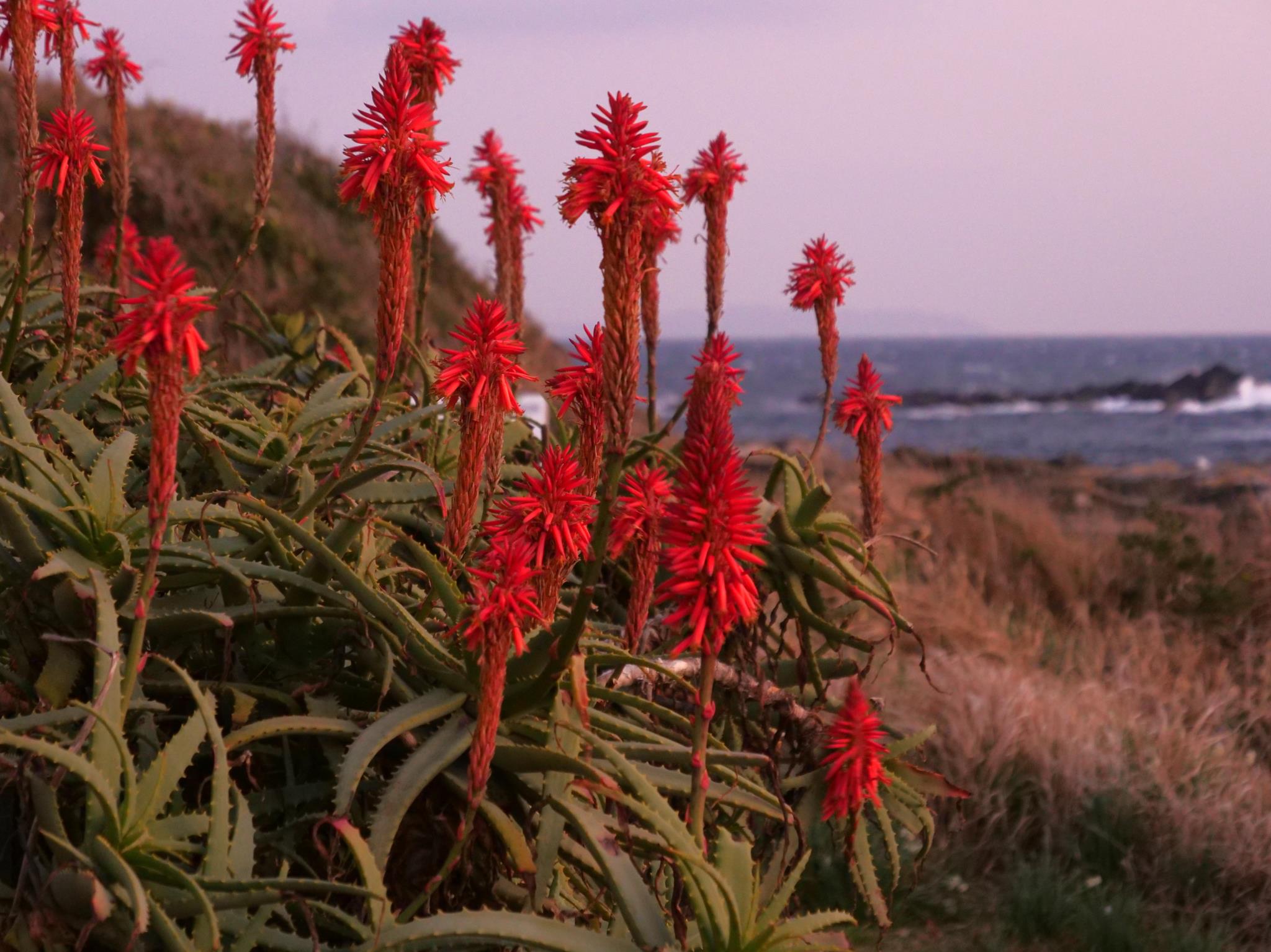 陽が傾いた情景がアロエの花の色で伝わりますね。背景のボケた海もゆっくりとした時間を感じます。