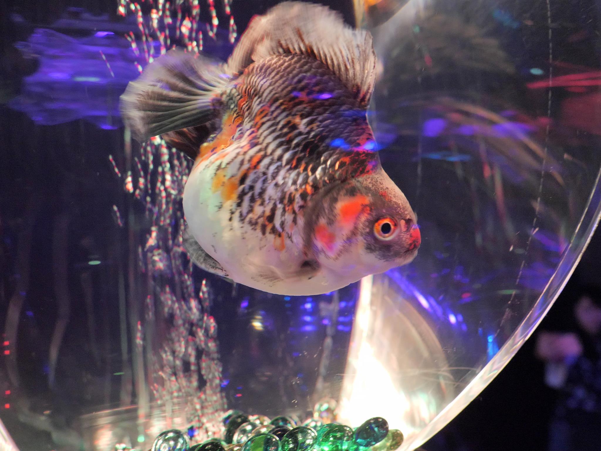 水槽のライトの具合で金魚の色が変わります。