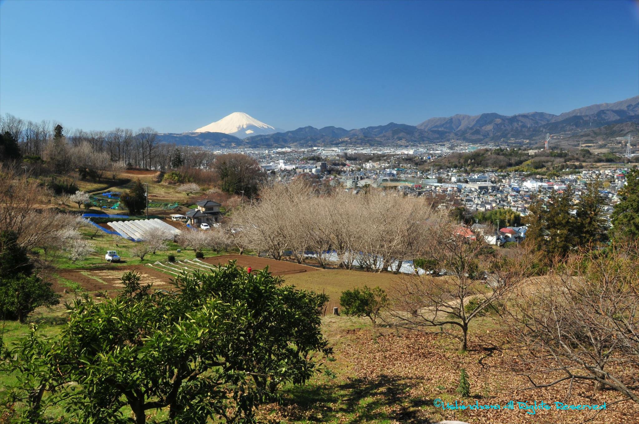 里山の向こうに雪をかぶった富士山、広々として長閑な風景が素晴らしいです。