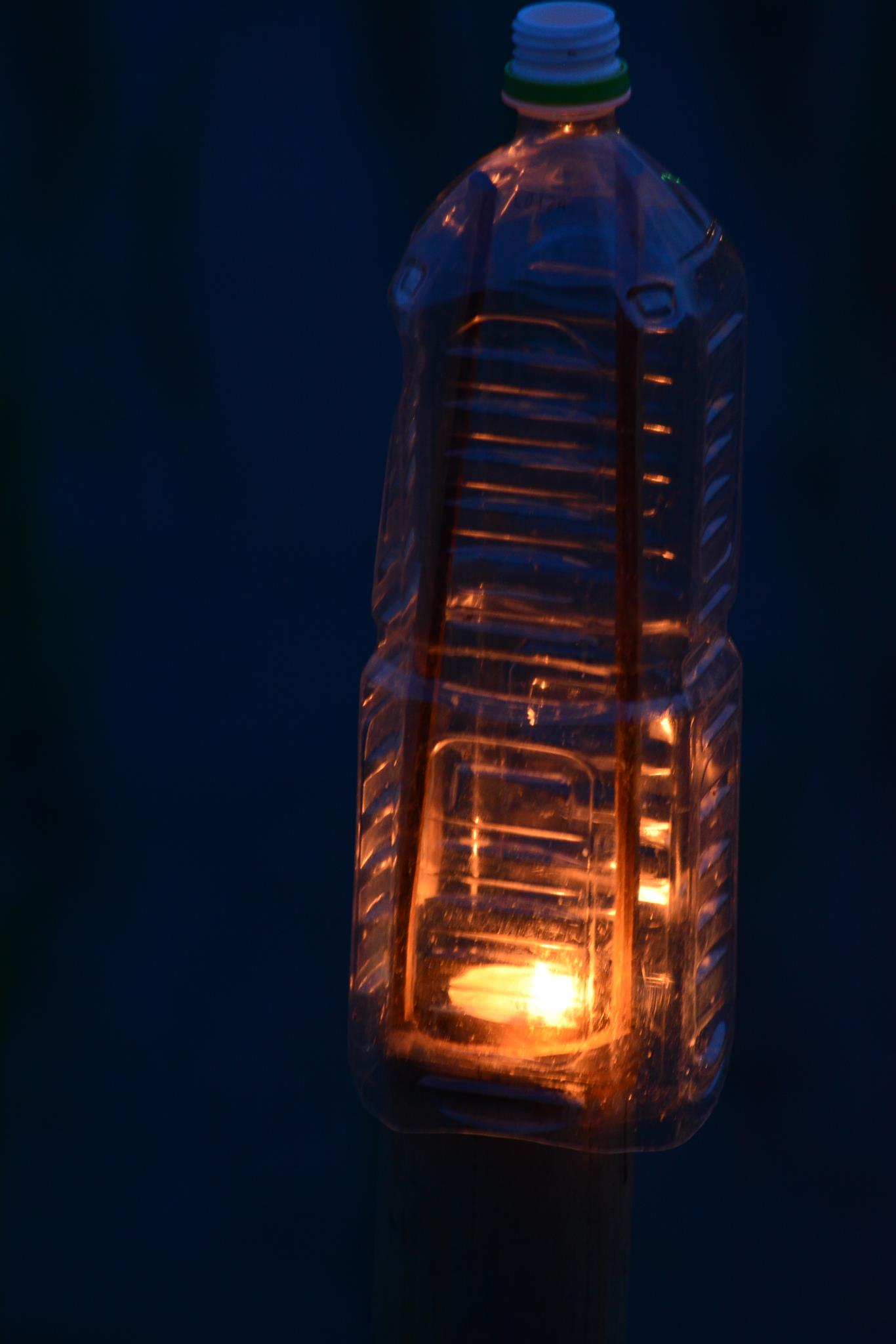 竹を切って作った燭台にペットボトルをかぶせてあります。