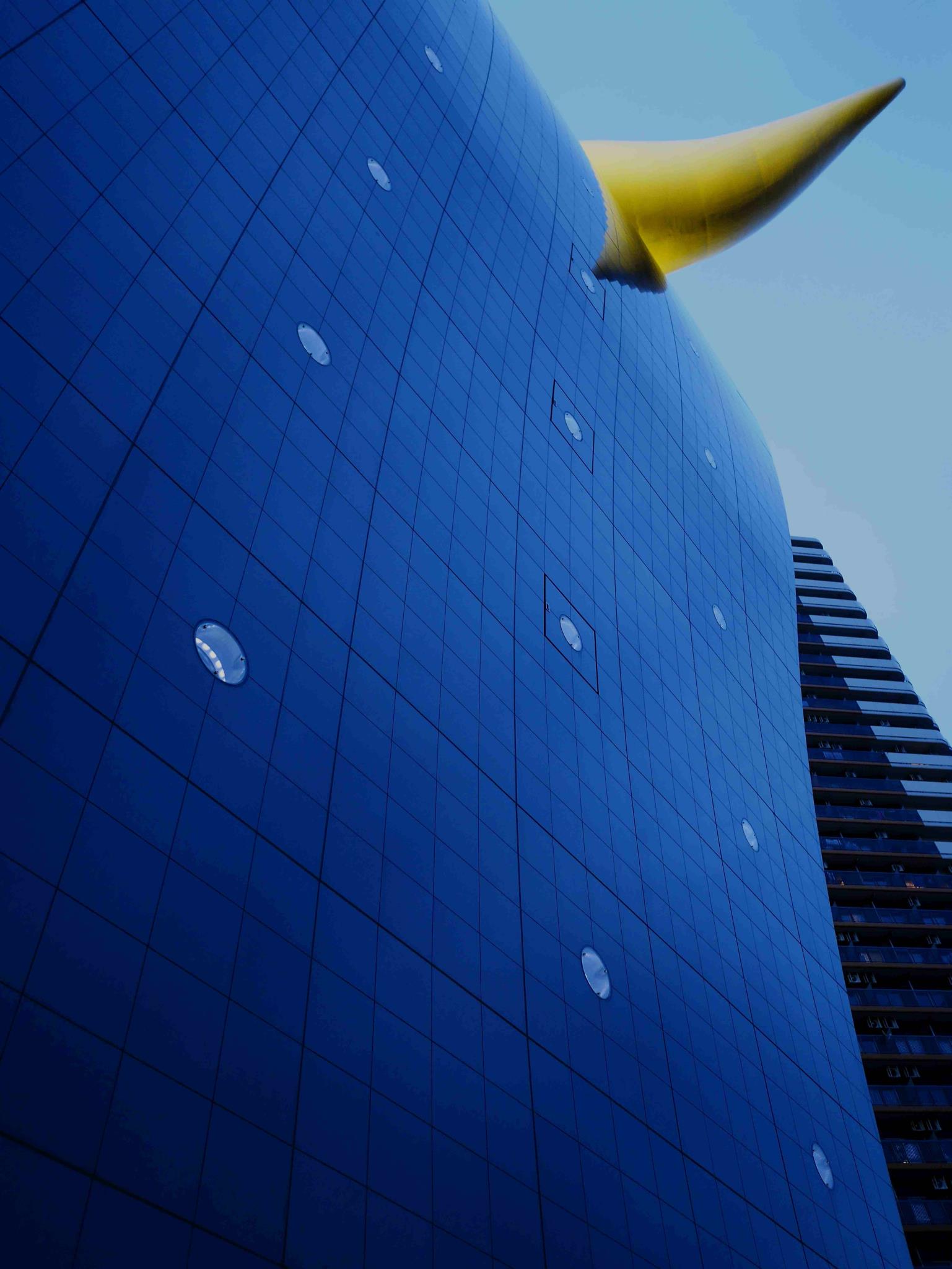 隅田川の対岸からのスカイツリーとのコラボの写真はよく目にしますが、スーパードライホールの下から見上げると、先端がビルに映りこむなど違った趣がありますよ。