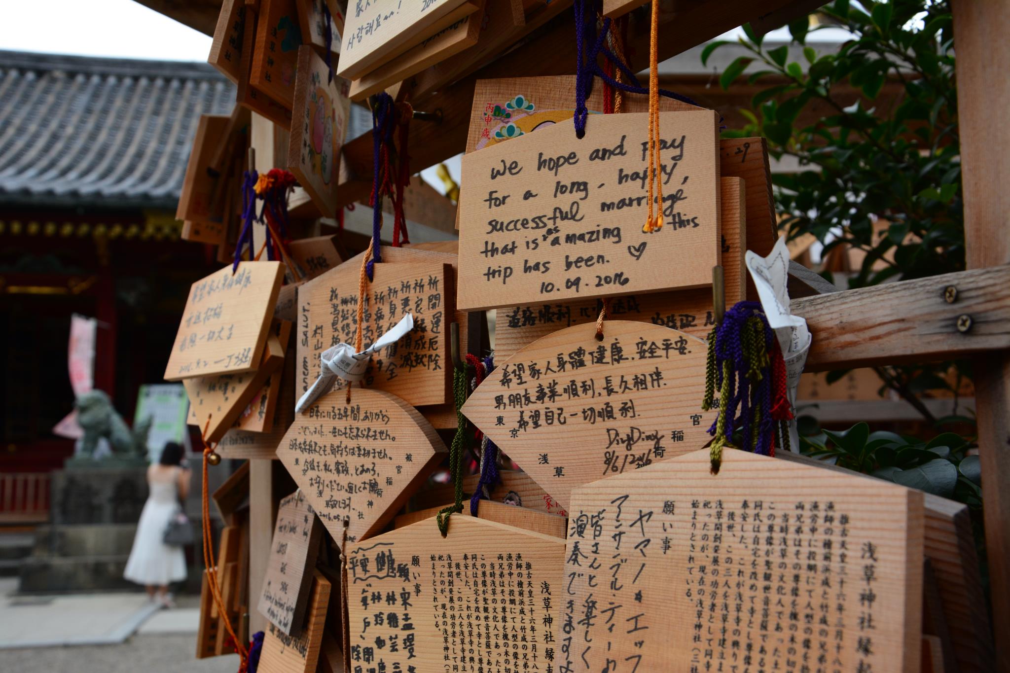 お願いごとを書いて(祈って)飾る、というのがいかにも日本らしくて、観光の記念にと書く方も多いのでしょうね。