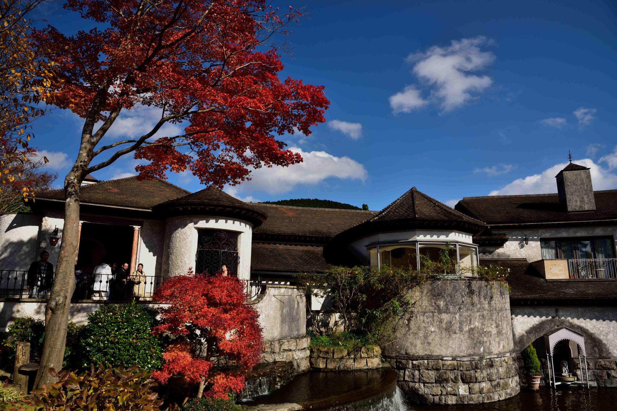 澄んだ空の青に、紅葉、白い建物、色のバランスがいいですね。