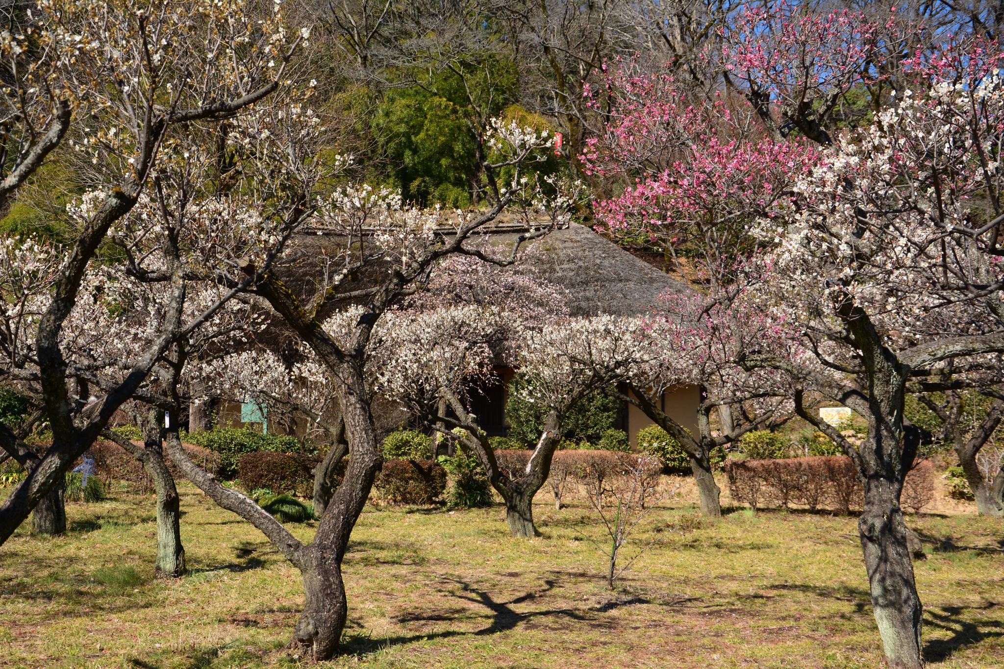 深いピントで捉えた紅白の梅が華やかさを競うようです。茅葺き屋根の質素なたたずまいと、葉の落ちた柴垣とは対象的です。組み合わせの妙です。