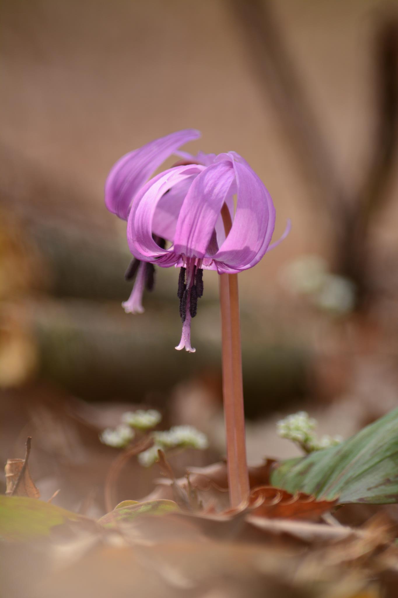 ボケ具合と、カタクリの下にある小さな白い花と、わき役が効いている写真だと思います。いい咲き具合のカタクリの花が綺麗なのはもちろんですが。