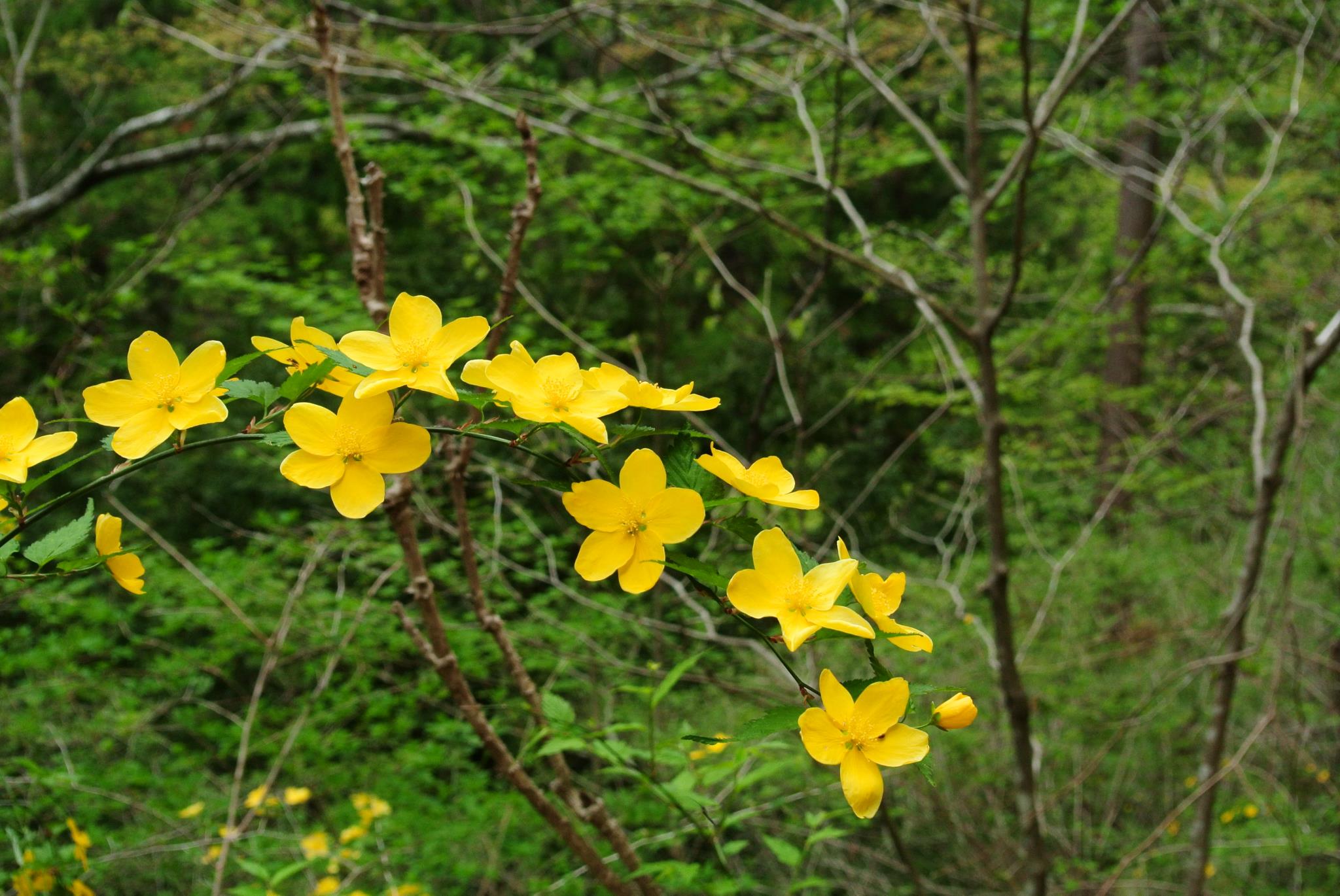 黄色花はヤマブキですかね。八重咲きもありました。似た名前ではヤマブキ草がありますが、板橋区では二輪草の後に咲く4月の花です。