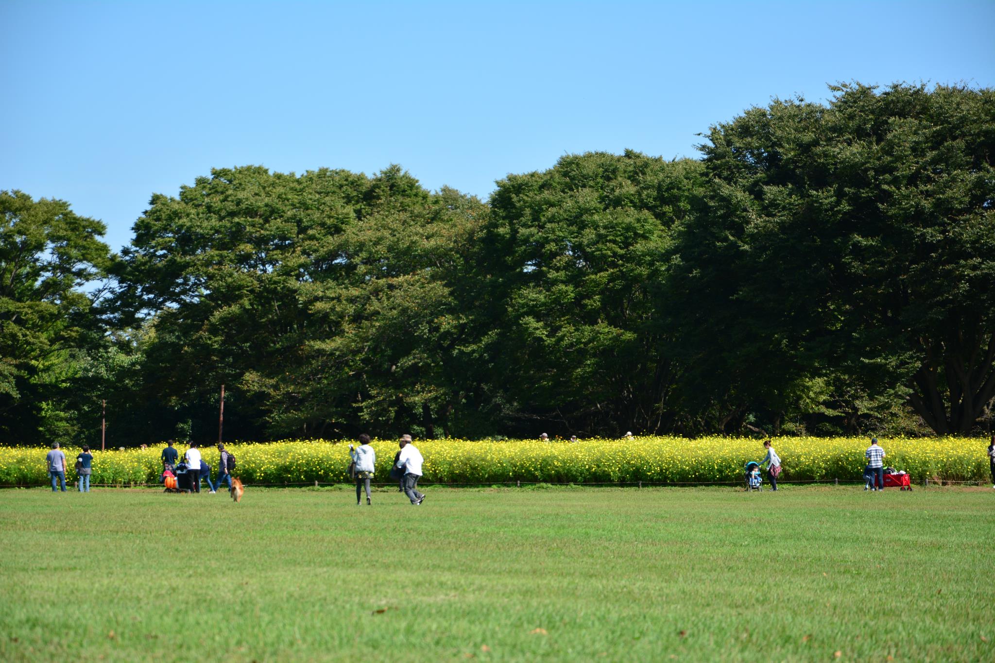 このレモン色のコスモスが爽やかでいいですね。人の配しかた、奥の木立とも横広がりで、気持ちがいいです。
