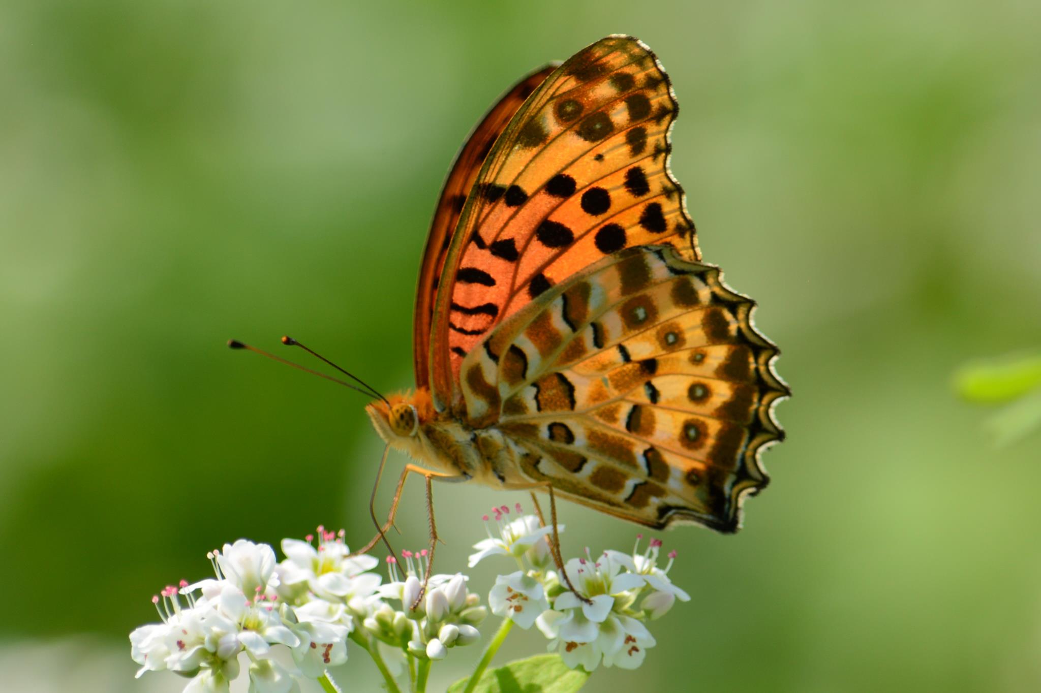 この時期としては痛みのない羽のツマグロヒョウモンですね。白い蕎麦の花と透明感の羽が綺麗です。