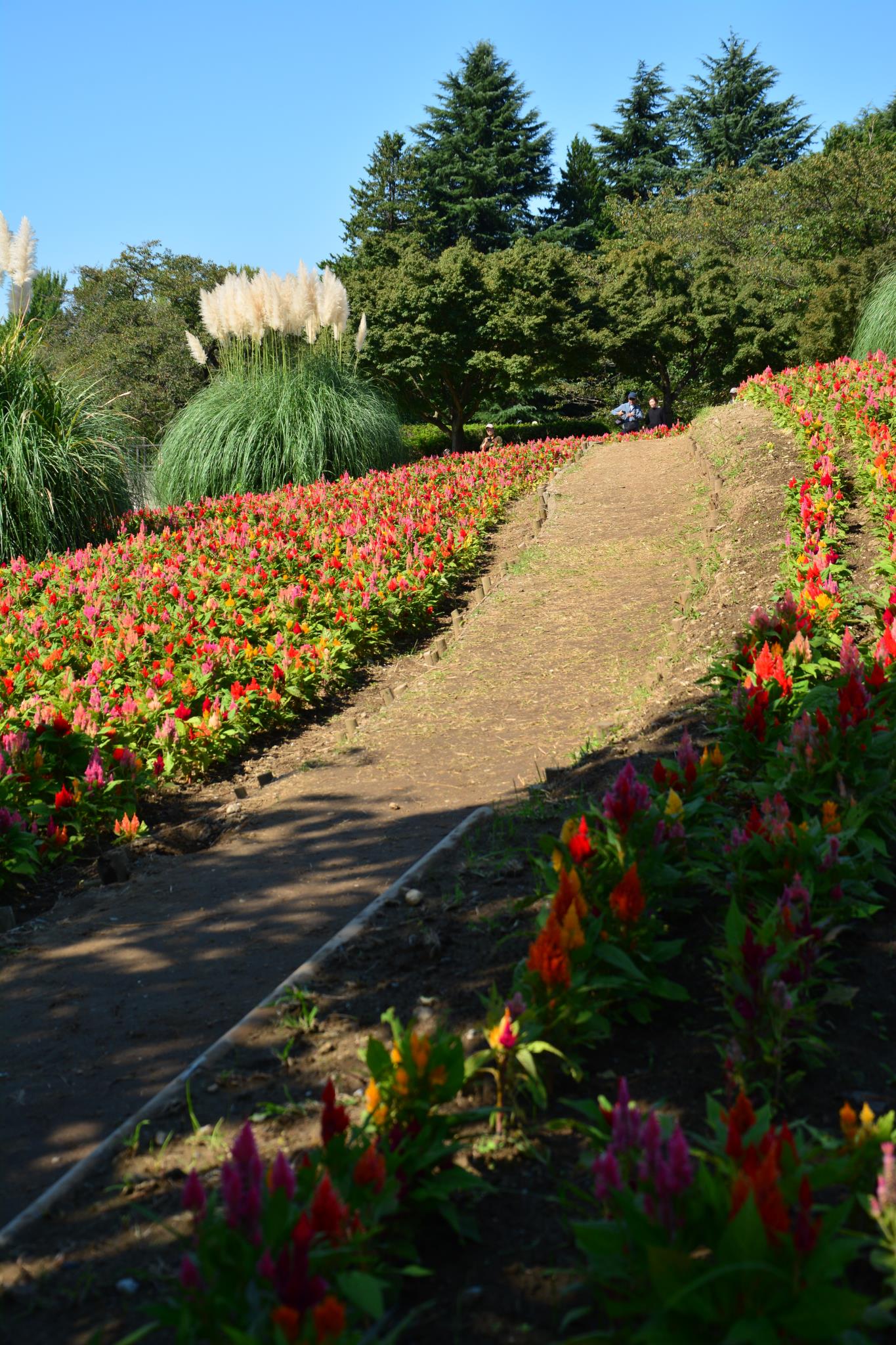 ケイトウの花畑は、バーベキューガーデンから渓流広場へ向かう途中にあります。