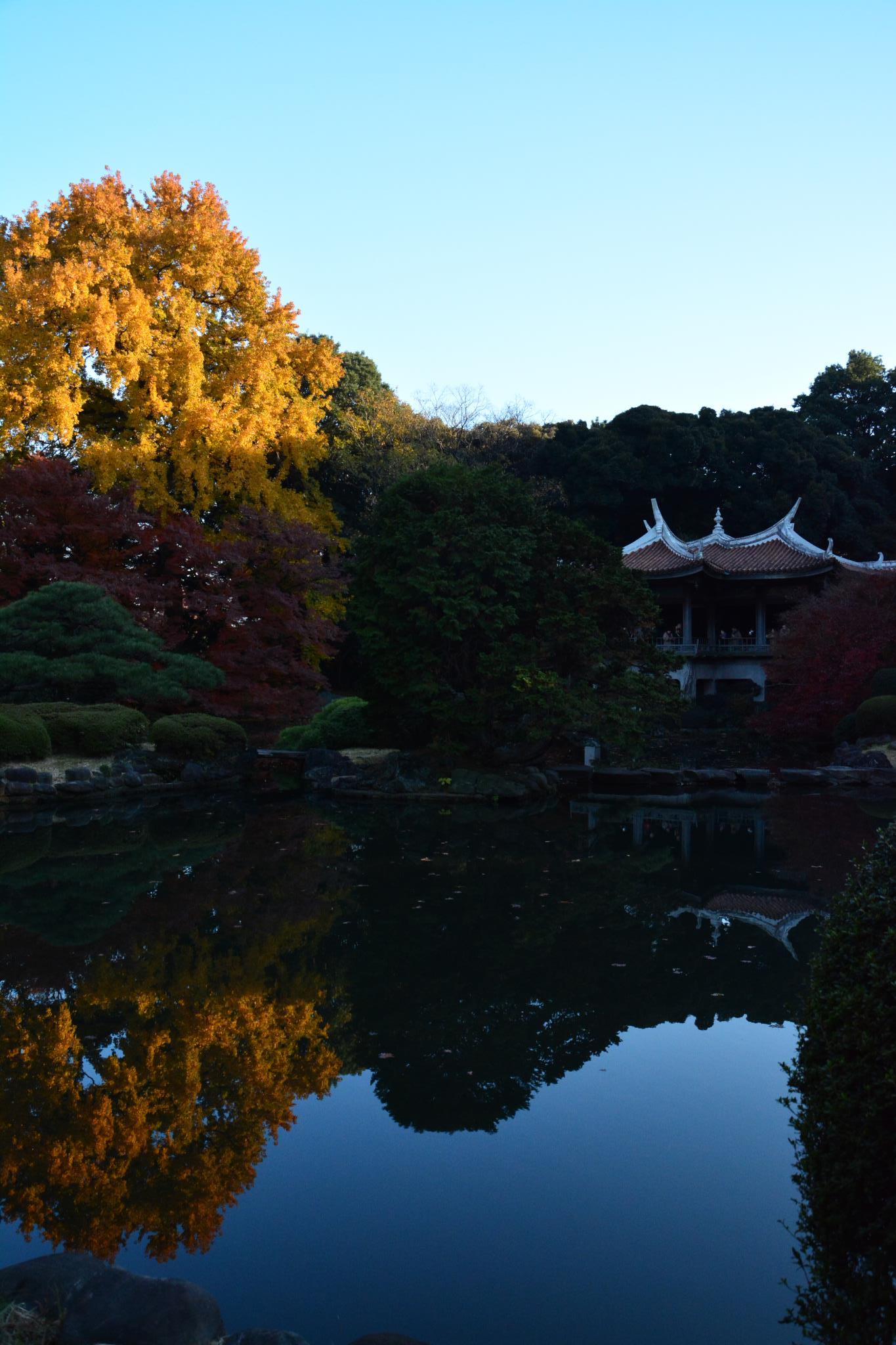 御苑の写真によく登場する中国風の構造物。群青の水面がお似合いです。わたしたち三人は四ツ谷の後は、主婦会館でブッフェをいただきました。若いころ隣の六番町には10年程居ましたが、主婦会館のブッフェは初めてでした。カメラの話がつきず、閉店の2時15分まで粘りました。