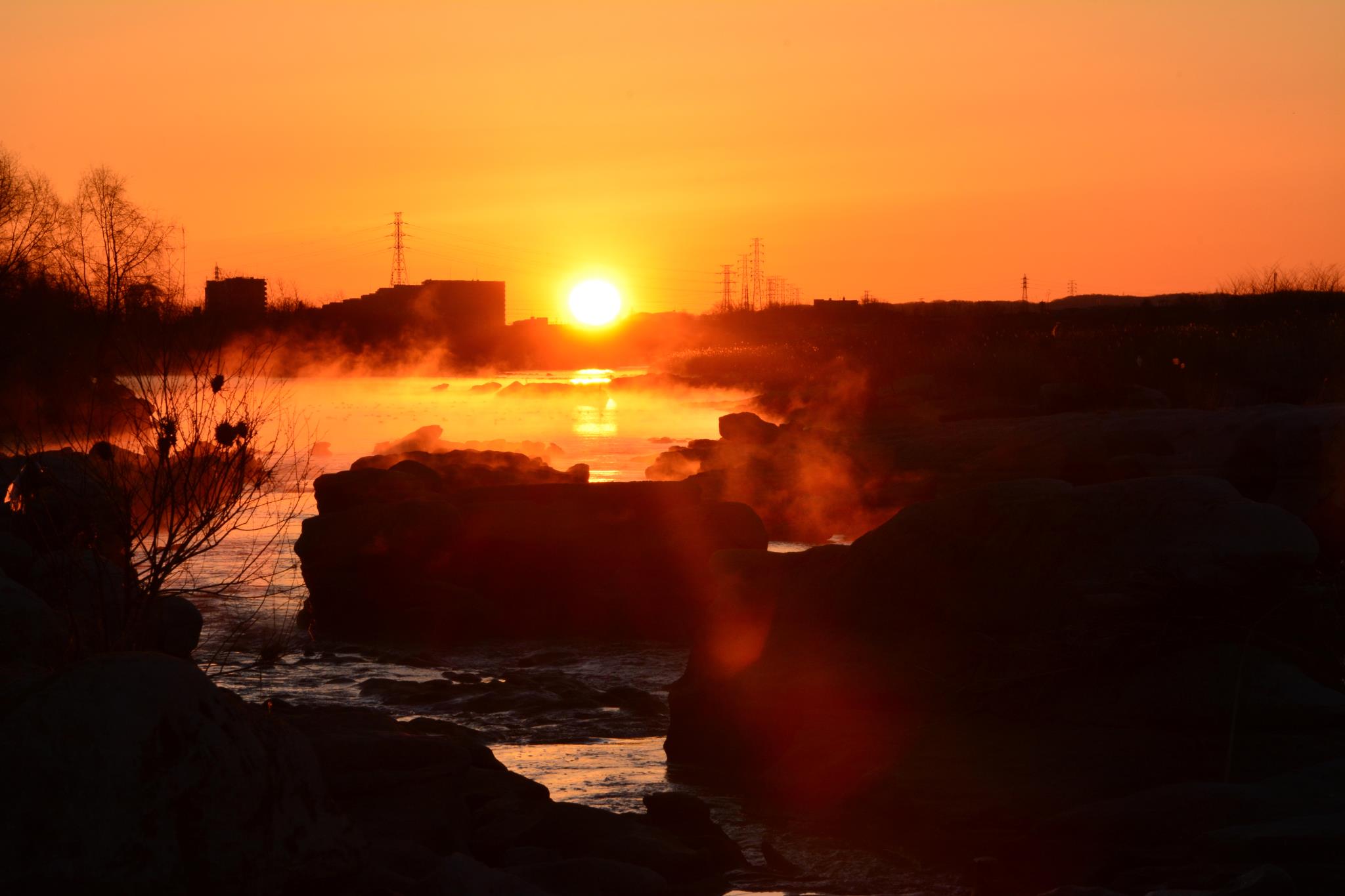 朝の厳しい寒さなのに、昇ったばかりの太陽の色は温かみさえ感じます。