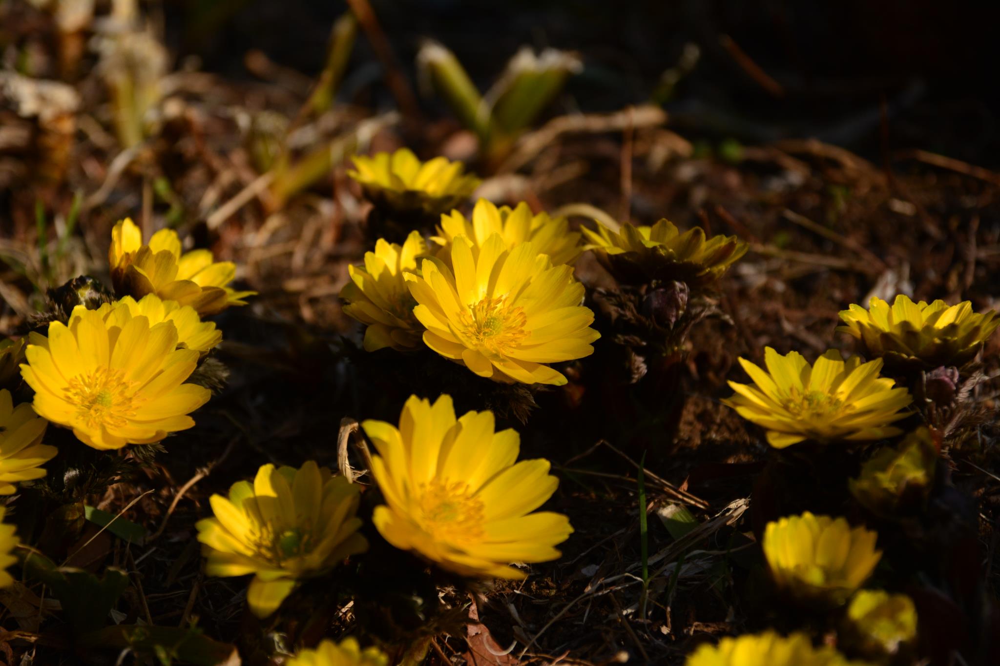 たくさんの花、暖かくなり一斉に咲いたようですね。とても綺麗ですね。福寿草は露出がなかなか難しい被写体です。強い日差しがあると反射でディティールが失われます。この作品は柔らかい光で丁度良いですね。