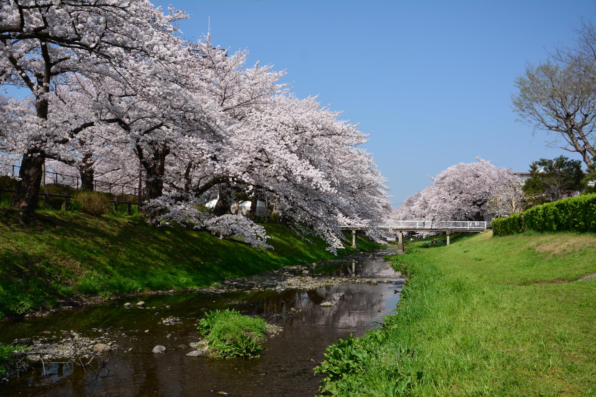近くの川沿いに立派な大きな木の桜並木があるのですね。片側の緑が桜を引き立てていますね。