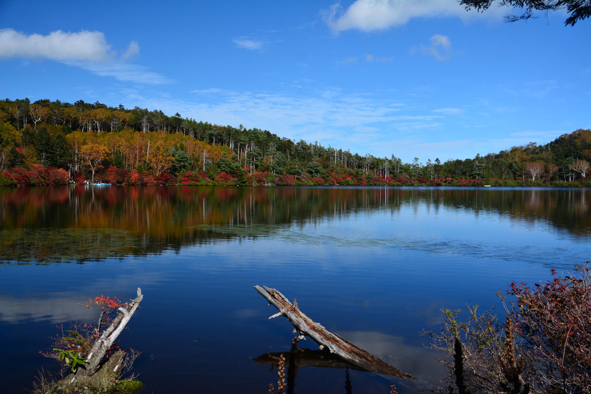 前景が朽ちた木、中景色は水面、背景は紅葉と