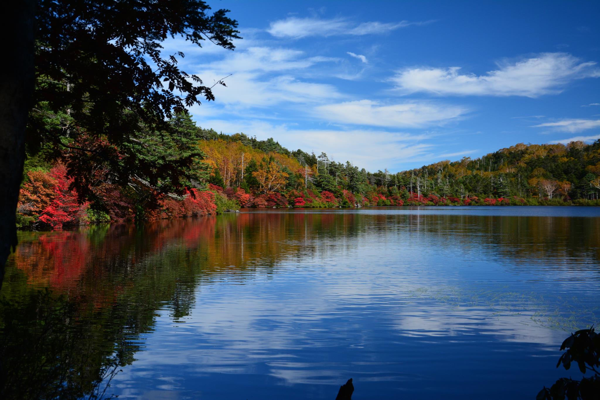 定番の景観ですが,何と言ってもこのアングルは外せないでしょう。青空に映える白駒湖の紅葉は実に美しく呆気に取られますね。