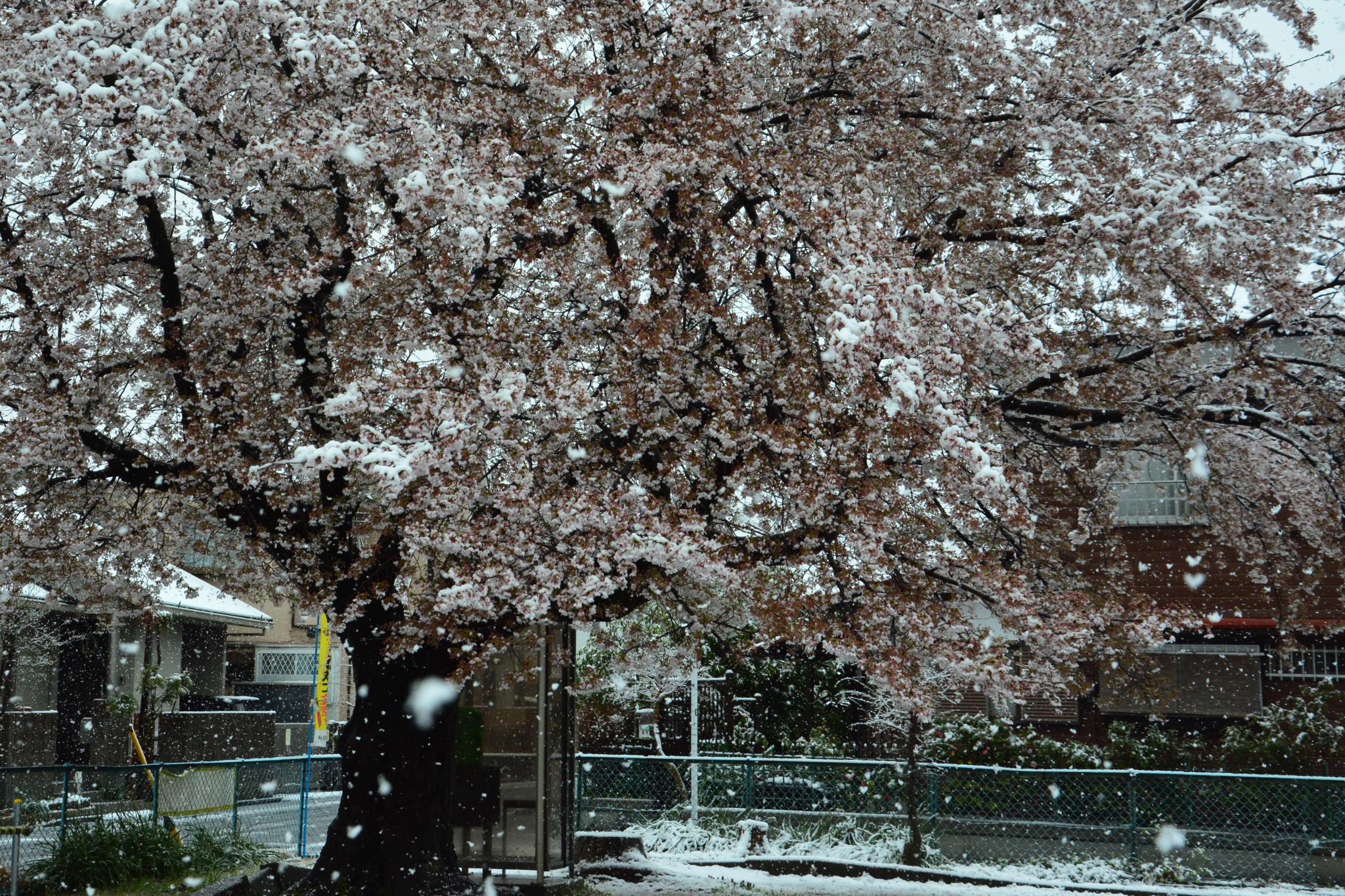 今春最後の雪でした。桜に積もる雪はなかなか出会えないです。一春で2回花が咲いた感じでですね。