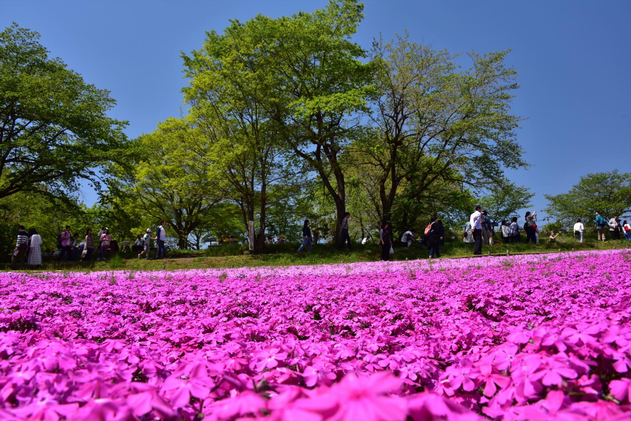 青空の下で新緑と赤い芝桜の三原色を使って綺麗に配置して見事ですね。