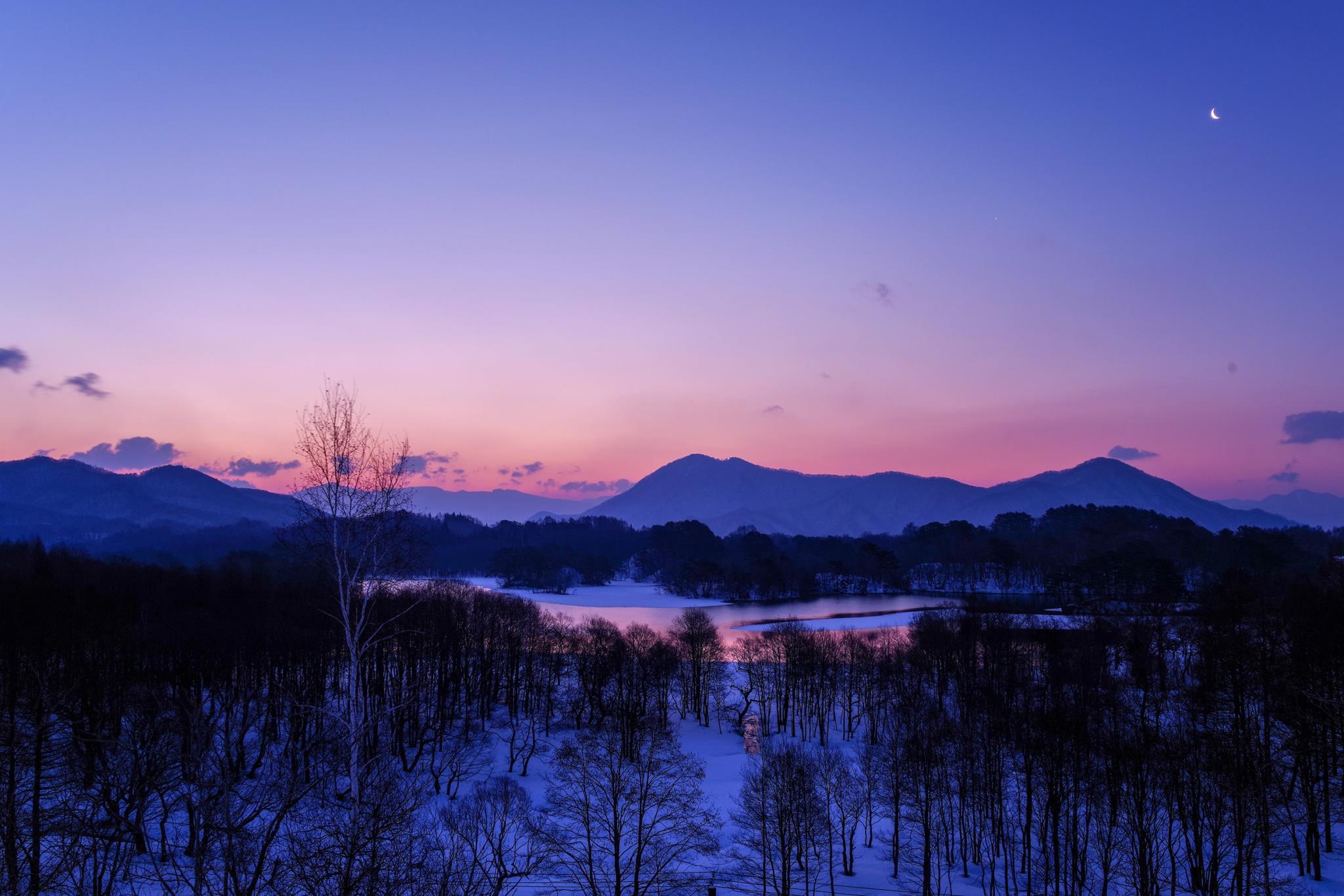 暁光が大空のみならず、湖のほとりの雪野原を染めて綺麗です。月に空の大きさを感じます。