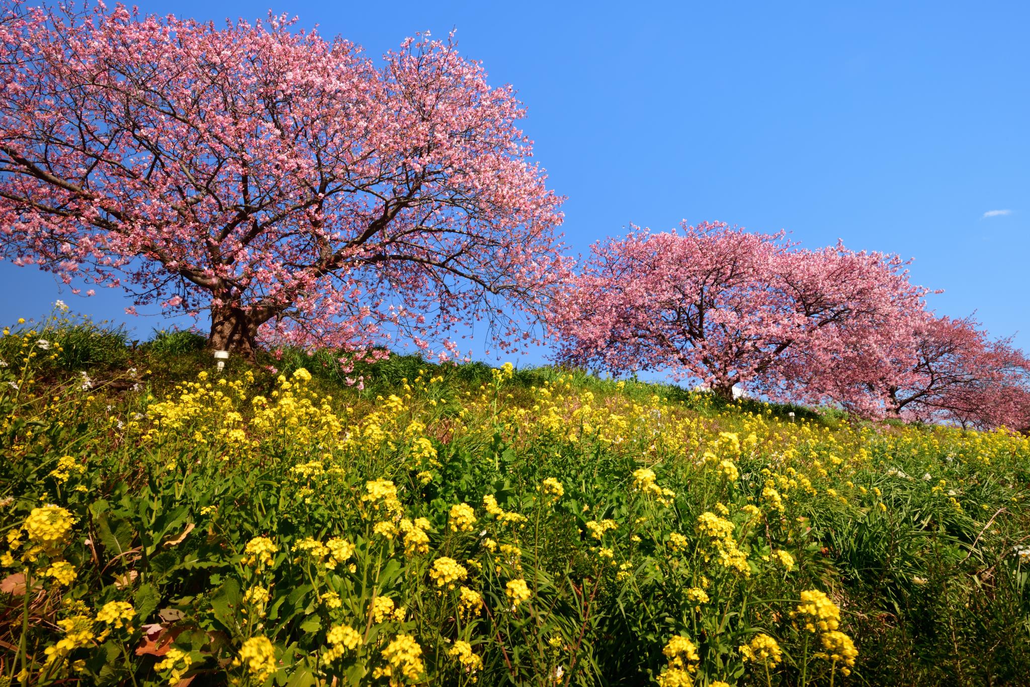 青空の中で赤色の濃い河津桜と濃い黄色の菜の花のコラボが一層引き立ちますね。