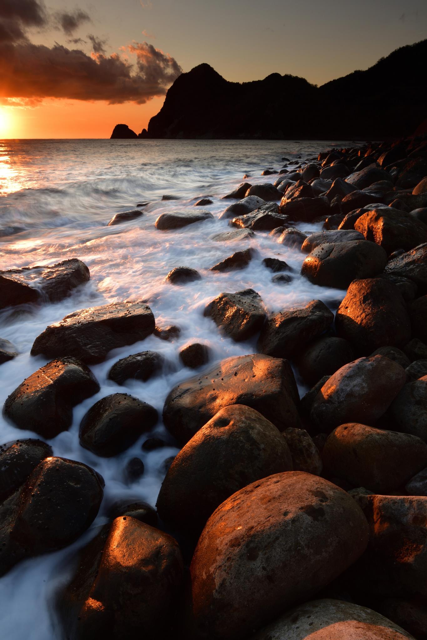 沈む太陽が最後の力を振り絞るように丸い石を赤く