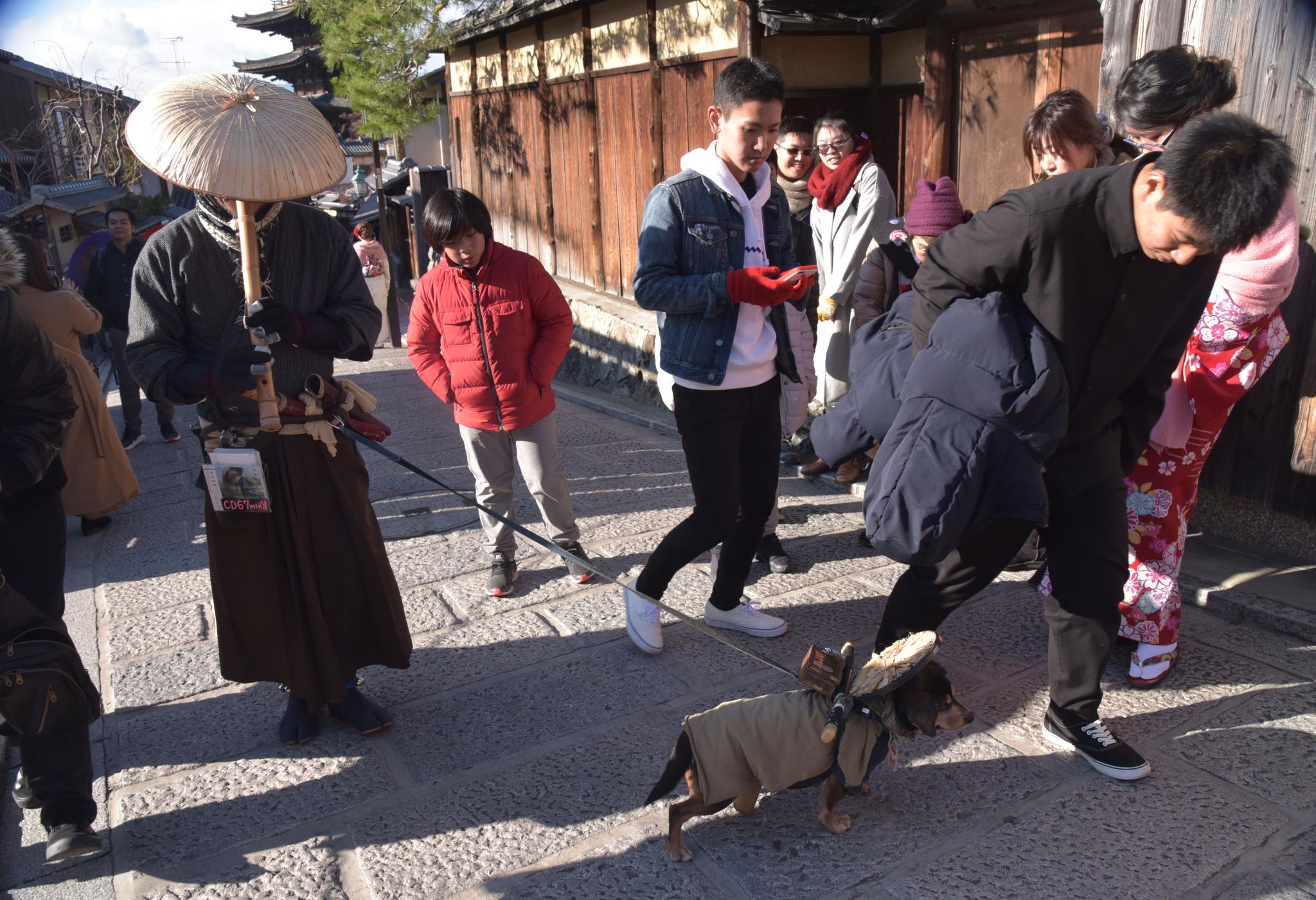 私も今回始めてみました。侍犬と言うそうです。尺八を吹きながら徘徊し、犬が通りの人に寄って行って愛想を振りまきます。思わず背中の箱に100円入れてしまいます。箱には100円玉が貼り付けてあってそれ以下は受け付けないようです。それでも嫌味を感じることなく投入してしまいます。面白いですよね。