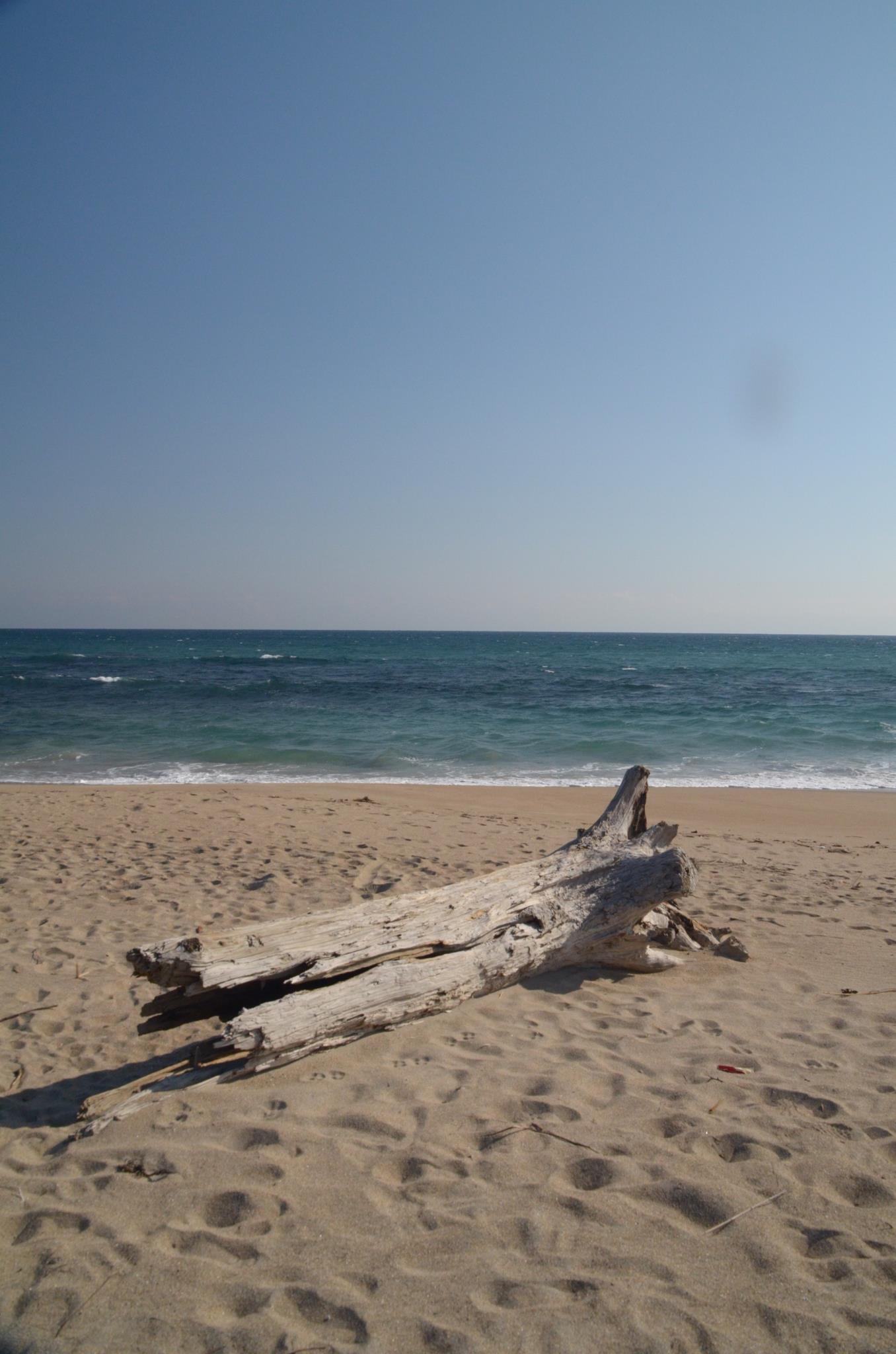 足跡は地元の人たちが犬の散歩でつけたものです。流木は台風のときに流れ着いたようです。丁度よいオブジェなので処分をせず、そのままにしているようです。自然の美ですかね。