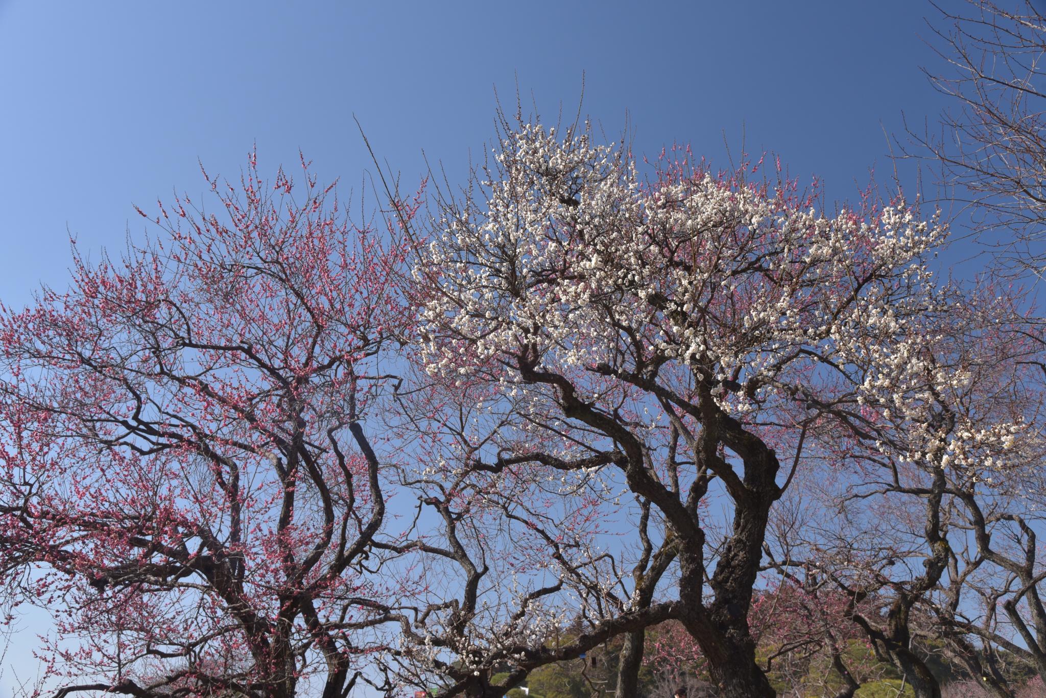 この2本は偕楽園で2番目ぐらいに開花する樹です。前の写真の場所から昇り終えたところに存在します。ここも午前中が綺麗です。今回はやや逆光気味になってしまうのでカメラをずらして空に向けました。紅梅が暗くなってしまいました。