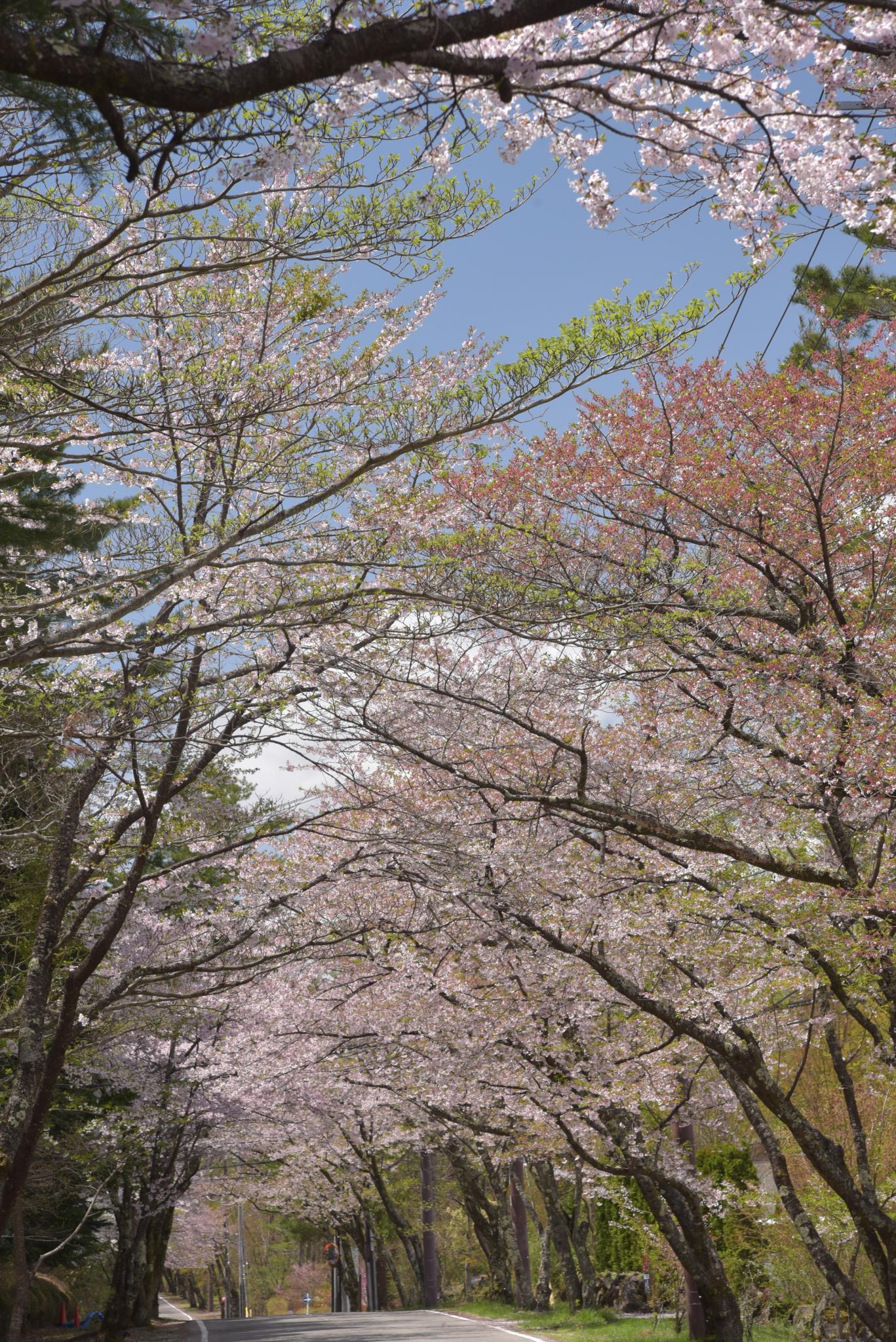 並木の表現を最大にと思い縦位置で道路を入れました。桜はソメイヨシノではありませんが品種は良くわかりません。山桜なら葉が出ていても良さそうですし、富士桜はこれほど大きな木はなさそうですし山桜の一種ですかね????
