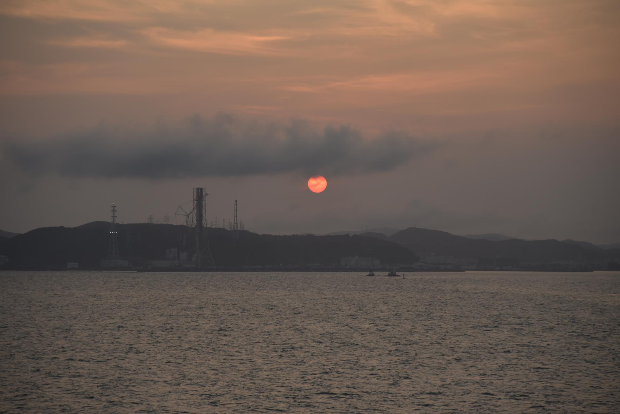 この場所に来たら雲がかかっていました。回り込むまでは雲の無い夕日でしたが、雲がアクセントになり、画になったように思います。