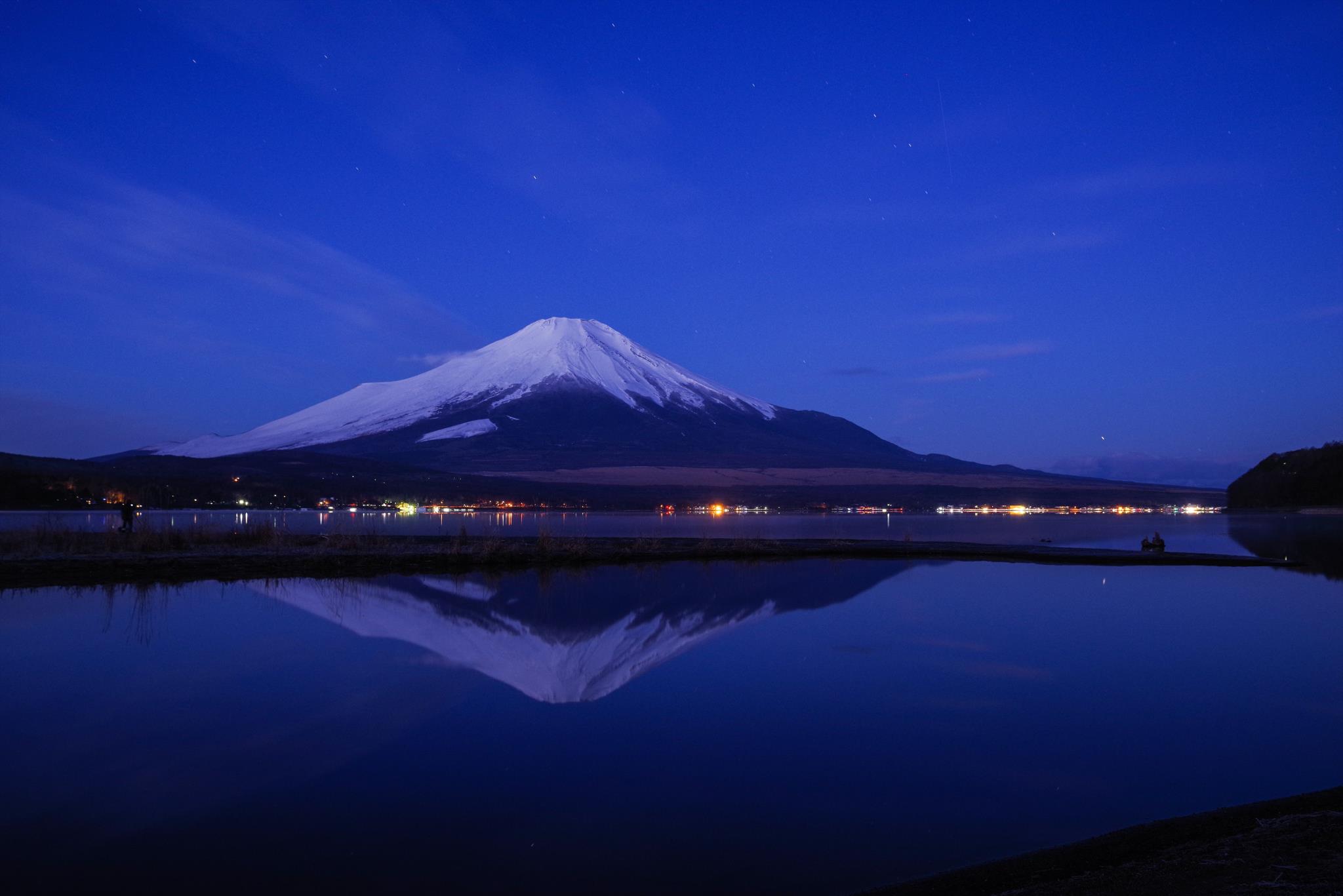 快晴の中の富士山が静寂な湖面に見事に映り込んで素晴らしい光景です。町の明かりにインパクトありますね。