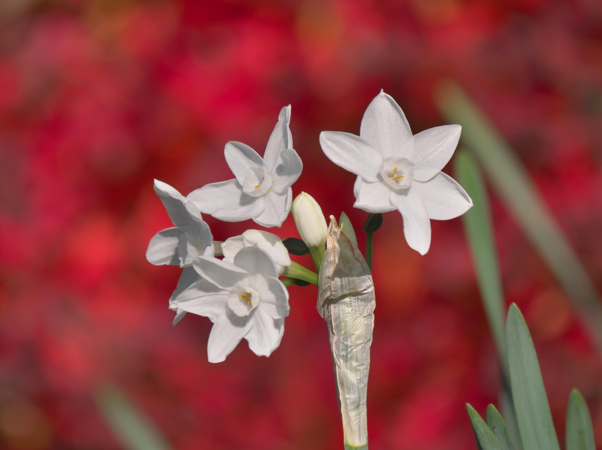 水仙も咲き始めましたね。背景の赤が良いですね。