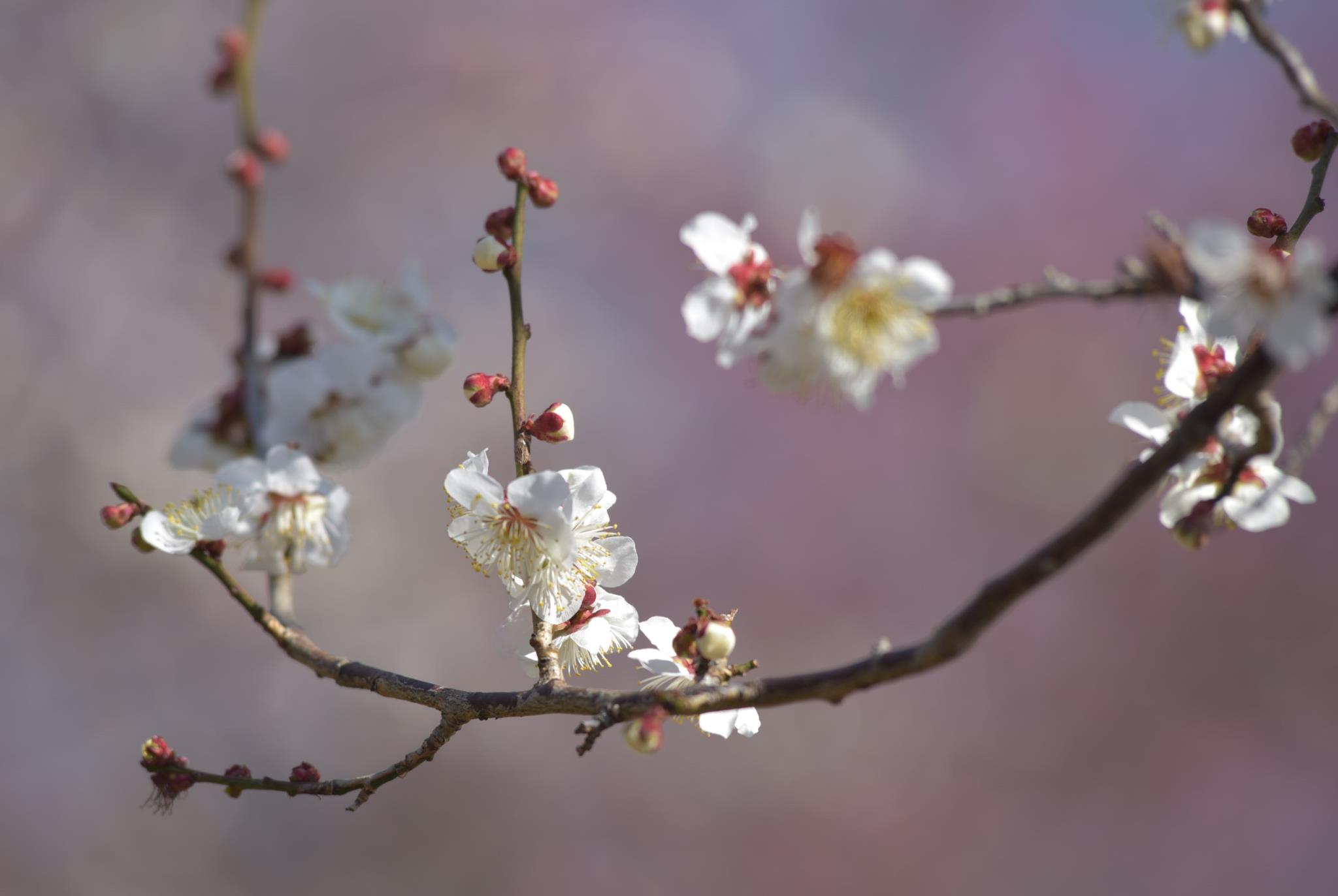 紅梅の淡いピンク背景だから美しっく映える白梅です。